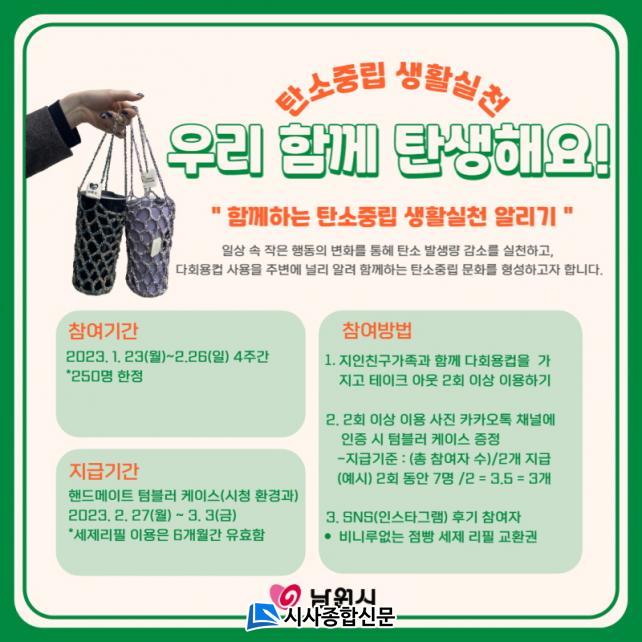 ¶ÇÇÑ ÀÏȸ¿ëÄÅ ´ë½Å ÅÒºí·¯¡¤´Ùȸ¿ë ÄÅ »ç¿ëÀ» ÁÖº¯¿¡ ³Î¸® ¾Ë·Á ÇÔ²²Çϴ ź¼ÒÁ߸³ ¹®È Çü¼ºÀ¸·Î ¡°¿ì¸® ÇÔ²² ź»ý(ź¼ÒÁ߸³ »ýȰ½Çõ, ÀÌÇÏ Åº»ý)ÇØ¿ä!¡±µµ ÃßÁøÇÑ´Ù.