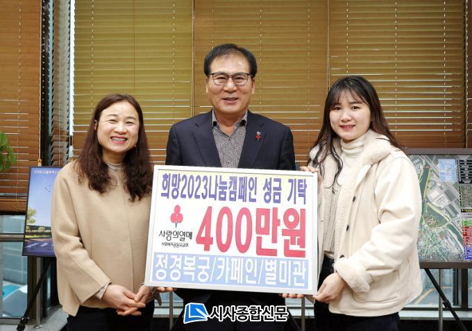 Á¤°æº¹±Ã°ú Ä«ÆäÀΡ¤º°¹Ì°ü ´ëÇ¥´Â ¸ð³à Áö°£À¸·Î Áö¿ª Áֹε鿡°Ô ¹ÞÀº »ç¶û¿¡ Á¶±ÝÀ̳ª¸¶ º¸´äÇϱâ À§ÇØ ¼º±ÝÀ» ±âŹÇÏ°Ô µÆ´Ù°í ÀüÇß´Ù. ¶ÇÇÑ °°Àº ³¯ ¢ß¾¾¿£¿¡ÇÁÇÔÆò(´ëÇ¥ Á¤¿øÀÏ)¿¡¼ ³Ãµ¿ °£°íµî¾î 150¹Ú½º(450¸¸¿ø »ó´ç)¸¦ ±âºÎÇϸç ÀÌ¿ô »ç¶ûÀ» ½ÇõÇß´Ù.