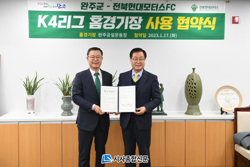 À¯ÈñÅ ¿ÏÁÖ±º¼ö¿Í Ç㺴±æ ÀüºÏÇö´ë¸ðÅͽºFC(ÁÖ) ´ëÇ¥ÀÌ»ç´Â 17ÀÏ ¿ÀÈÄ ¿ÏÁÖ±ºÃ» 4Ãþ ±º¼ö½Ç¿¡¼ ¡®ÀüºÏÇö´ëBÆÀ K4¸®±× Ȩ±¸Àå »ç¿ë °ü·Ã ¿ÏÁÖ±º°ú ÀüºÏÇö´ë Ȩ±¸Àå»ç¿ë Çù¾à½Ä¡¯À» °®°í ÀüºÏÇö´ë BÆÀÀÇ K4¸®±× Âü¿©¸¦ À§ÇØ ¿ÏÁÖ°ø¼³¿îµ¿ÀåÀ» Ȩ°æ±âÀåÀ¸·Î »ç¿ëÇϱâ·Î Çù¾àÇß´Ù.
