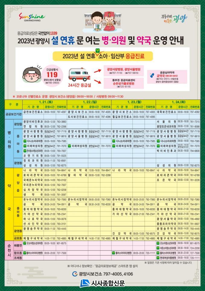¶ÇÇÑ, Áø·á °ø¹éÀ» ¹æÁöÇÏ°í ½Ã¹Î ºÒÆíÀ» ÃÖ¼ÒÈÇϱâ À§ÇØ »ç¶ûº´¿ø°ú (¹ý)Çö°æÀÇ·áÀç´Ü ±¤¾ç¼¿ïº´¿ø¿¡¼ ÀÀ±Þ½ÇÀ» 24½Ã°£ ¿î¿µÇϸç, ´çÁ÷ º´¡¤ÀÇ¿ø 11°³¼Ò, ÈÞÀÏÁöÅ´ÀÌ ¾à±¹ 19°³¼Ò, º¸°ÇÀÇ·á±â°ü 5°³¼Ò¸¦ ÁöÁ¤ ¿î¿µÇÑ´Ù.