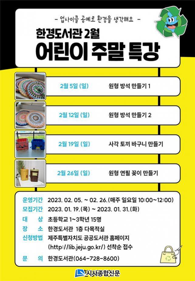 ÀÏÁ¤Àº 2¿ù 5ÀϺÎÅÍ 2¿ù 26ÀϱîÁö ¸ÅÁÖ ÀÏ¿äÀÏ ¿ÀÀü 10½ÃºÎÅÍ 2½Ã°£ µ¿¾È ÃÑ 4ȸ ¿î¿µµÉ ¿¹Á¤ÀÌ´Ù. Âü¿© ½ÅûÀº 1¿ù 19ÀÏ ¿ÀÀü 10½ÃºÎÅÍ 1¿ù 31ÀϱîÁöÀ̸ç, Á¦ÁÖµµ °ø°øµµ¼°ü ȨÆäÀÌÁö(www.jeju.go.kr/lib)¸¦ ÅëÇØ 15¸í±îÁö ¼±Âø¼ø Á¢¼ö°¡ °¡´ÉÇÏ´Ù.