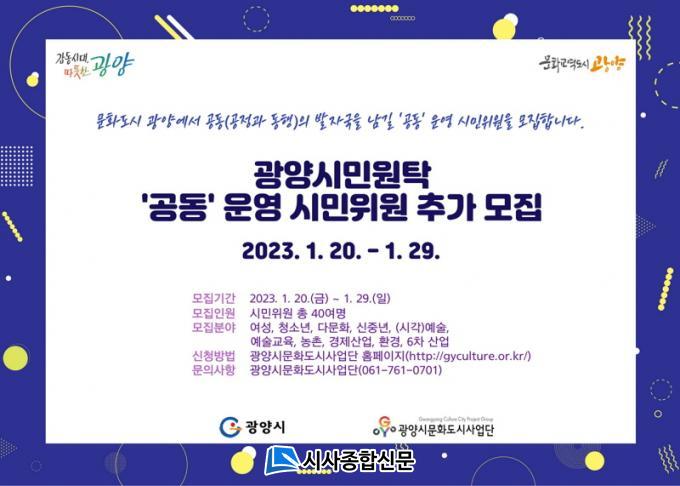 °øµ¿ À§¿ø ¸ðÁý°ú °ü·ÃµÈ ÀÚ¼¼ÇÑ ³»¿ëÀº ±¤¾ç½Ãû, ±¤¾ç½Ã¹®Èµµ½Ã»ç¾÷´Ü ȨÆäÀÌÁö¿¡¼ È®ÀÎÇÒ ¼ö ÀÖÀ¸¸ç, ½Åû¼´Â À̸ÞÀÏ(gycc2022@hanmail.net)·Î Á¦Ãâ °¡´ÉÇÏ´Ù.