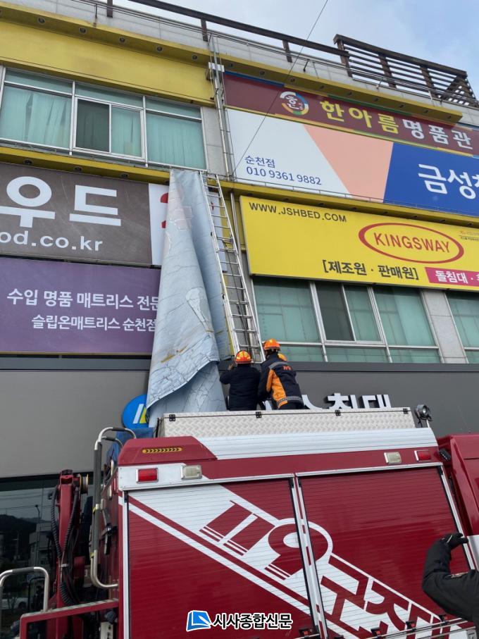 ¼øÃµ¼Ò¹æ¼ 119±¸Á¶´ë´Â ÇöÀåµµÂøÇÏ¿© °Ç³¿¡ ÀÇÇØ ¶³¾îÁø Ç÷¡Ä«µå¸¦ È®ÀÎÇϰí, ¾ÈÀü»ç°í ¹æÁö¸¦ À§ÇØ °Ç¹° ¿Üº®¿¡ ÀÖ´Â ´ëÇü Ç÷¡Ä«µå¸¦ Á¦°ÅÇÏ¿´´Ù.