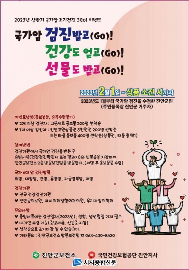 Âü¿© ¹æ¹ýÀº 2023³â 1¿ùºÎÅÍ ±¹°¡¾Ï °ËÁø Á¾¸ñ(À§¾Ï, ´ëÀå¾Ï, °£¾Ï, Æó¾Ï, À¯¹æ¾Ï, ÀڱðæºÎ¾Ï)À» ¼ö°ËÇϰí, 2¿ù 1ÀÏ ÀÌÈÄ ¾Ï°ËÁø ¼ö°ËÀ» Áõ¸íÇÏ´Â ¼·ù(°Ç°°ËÁøÈ®Àμ ¶Ç´Â °Ç°°ËÁø°á°úÁö)¿Í ½ÅºÐÁõÀ» °¡Áö°í Áø¾È±ºº¸°Ç¼Ò 2Ãþ ¹æ¹®º¸°ÇÆÀ¿¡ ¹æ¹®ÇØ ¼¸í ÈÄ À̺¥Æ® »óǰ(È«º¸¹°Ç°)À» ¼ö·ÉÇÒ ¼ö ÀÖ´Ù.