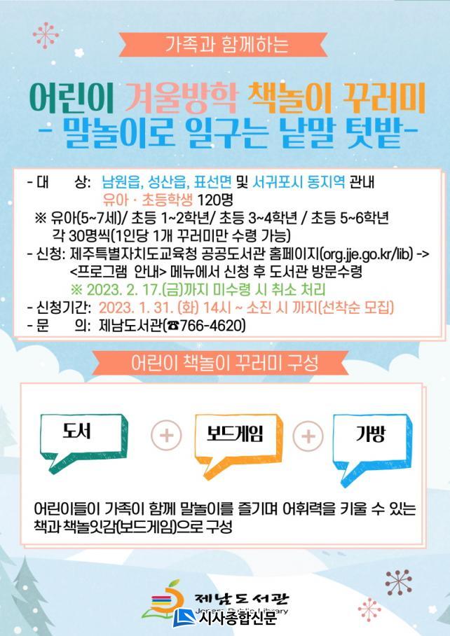 [½Ã»çÁ¾ÇսŹ® = °í¼º¹Î ±âÀÚ] Á¦³²µµ¼°ü(°üÀå ȲÁ¤½Ä)Àº °Ü¿ï¹æÇе¿¾È °¡Á¤¿¡¼ °¡Á·°ú ÇÔ²²ÇÏ´Â ½Ã°£À» ÅëÇØ ¾î¸°À̵éÀÇ ²ÙÁØÇÑ µ¶¼ Ȱµ¿À» µ¶·ÁÇϰíÀÚ¡®°Ü¿ï¹æÇÐ ¾î¸°ÀÌ Ã¥³îÀÌ ²Ù·¯¹Ì ÇÁ·Î±×·¥ – ¸»³îÀÌ·Î Àϱ¸´Â ³¹¸» ÅԹ硯ÀÇ Âü°¡ÀÚ¸¦ ¸ðÁýÇÑ´Ù.