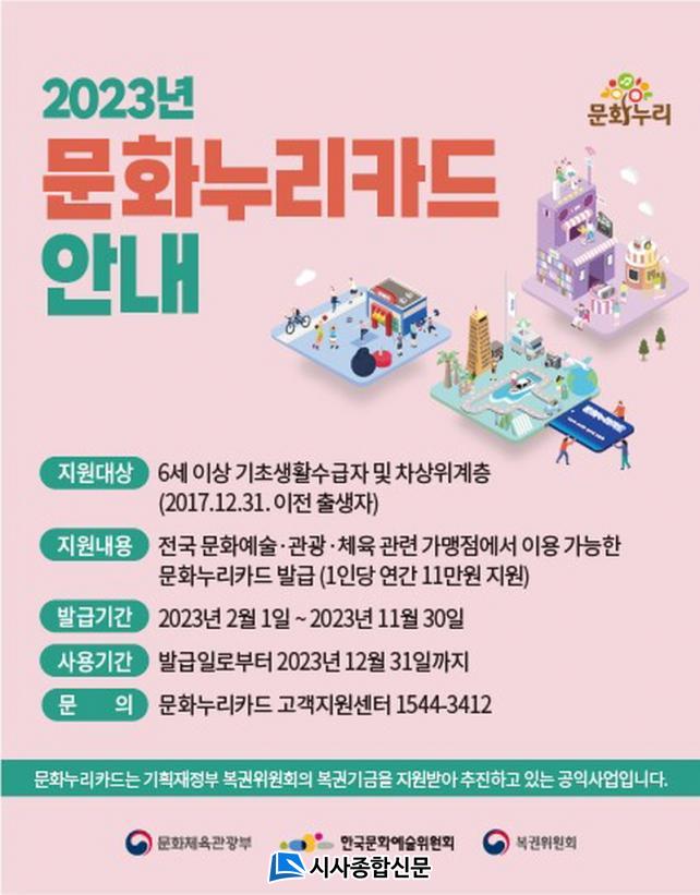 ¹®È´©¸®Ä«µå´Â Àú¼ÒµæÃþÀÌ ¹®È¿¹¼ú․¿©Çà․üÀ°È°µ¿À» Çϴµ¥ »ç¿ëÇÒ ¼ö ÀÖµµ·Ï ¹ß±ÞÇÏ´Â Àü¿ëÄ«µå·Î, 6¼¼ ÀÌ»ó(2017³â 12¿ù 31ÀÏ ÀÌÀü Ãâ»ý)ÀÇ ±âÃÊ»ýȰ¼ö±ÞÀÚ¿Í Â÷»óÀ§ °èÃþ¿¡°Ô 1ÀÎ´ç ¿¬°£ 11¸¸ ¿øÀ» Áö¿øÇÑ´Ù. Ä«µå ¹ß±ÞÀº 11¿ù 30ÀϱîÁö¸ç, ¿ÃÇØ ¿¬¸»±îÁö »ç¿ë °¡´ÉÇÏ´Ù.¹Ì»ç¿ëÇÑ Àܾ×Àº ÀÚµ¿ ¼Ò¸êµÈ´Ù. Ä«µå ½ÅûÀº °¡±î¿î À¾¸éµ¿»ç¹«¼Ò¸¦ ¹æ¹®Çϰųª, ¹®È´©¸®Ä«µå ´©¸®Áý ¶Ç´Â ¸ð¹ÙÀϾۿ¡¼ ÇÏ¸é µÈ´Ù.