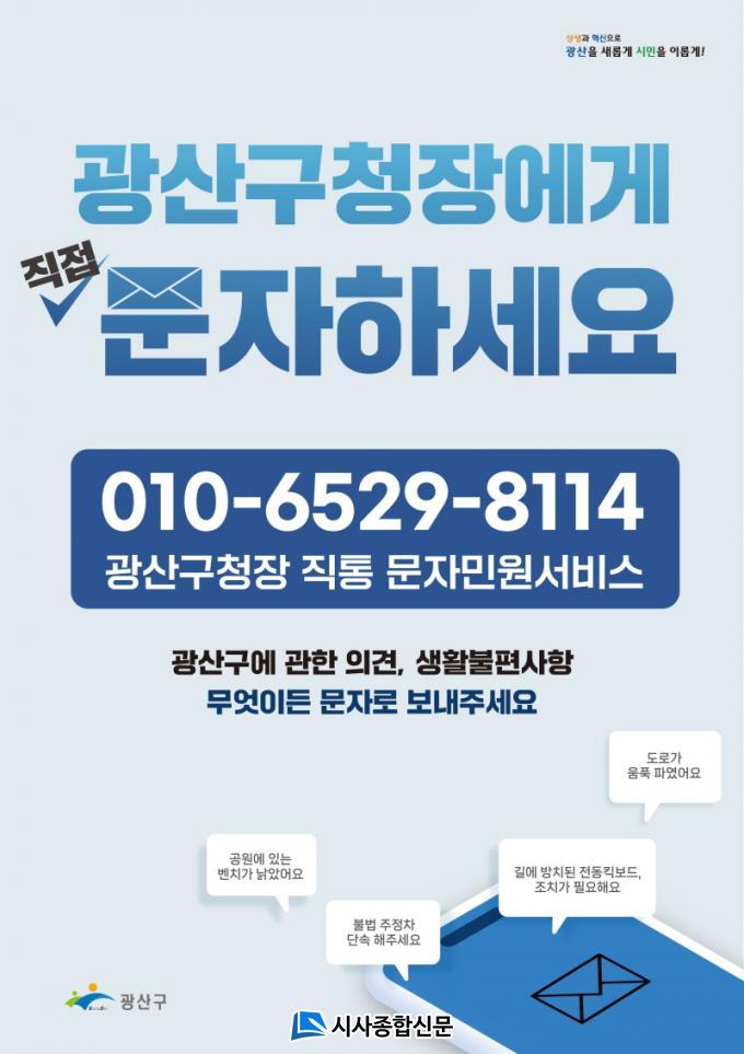 ±¸Ã»Àå Á÷Åë ¹®ÀÚÀü¿ë ¹øÈ£´Â 010-6529-8114À̸ç, ½Ã¹Î ´©±¸³ª ±¤»ê±¸¿¡ ´ëÇÑ Àǰß, »ýȰºÒÆí»çÇ× µîÀ» ¹®ÀÚ·Î º¸³»¸é ´äº¯°ú ÁøÇà »óȲ µîÀ» ½Å¼ÓÇÏ°Ô ¾È³»¹ÞÀ» ¼ö ÀÖ´Ù. Á¤±Ô ¿î¿µ½Ã°£ À̿ܿ¡µµ ¾ß°£, ÁÖ¸»‧°øÈÞÀÏ µî 24½Ã°£ ¹®ÀÚÀü¼Û(¹Î¿øÁ¢¼ö)ÀÌ °¡´ÉÇÏ´Ù.