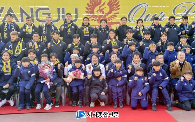 ±¸´ÜÁÖÀÎ °±âÁ¤ ±¤ÁÖ½ÃÀåÀº ¡°±¤ÁÖFCÀÇ ¸ñÇ¥´Â ´ç¿¬È÷ ¿ì½ÂÀ̰ÚÁö¸¸, ¿ì½Â ÀÌÀü¿¡ ÆÒµé·ÎºÎÅÍ ¿±¤Àû »ç¶ûÀ» ¹Þ¾Æ¾ß ÇÑ´Ù¡±¸ç ¡°½Ã¹Î±¸´ÜÀÎ ±¤ÁÖFC°¡ °øµ¿Ã¼ÀÇ ´ÜÇÕ°ú ±âȸ‧¼ºÀåÀÇ ±¤ÁÖ¸¦ ¸¸µå´Âµ¥ ¾ÕÀå¼ ÁÖ±æ ¹Ù¶õ´Ù¡±°í °Ý·ÁÇß´Ù. ±¤ÁÖFC´Â À̳¯ ¼±Æ÷½Ä°ú ÇÔ²² ³ëµ¿ÀÏ ½ÅÀÓ ´ëÇ¥ÀÌ»ç ÃëÀӽĵµ ÁøÇàÇß´Ù.