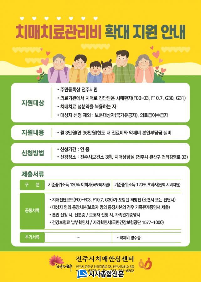 ÀüÁֽô ±×µ¿¾È Ä¡¸ÅÄ¡·á°ü¸®ºñ¸¦ Ä¡¸Å Áø´Ü(»óº´ÄÚµå F00~F03, F10.7, G30)À» ¹ÞÀº ÈÄ Ä¡¸ÅÄ¡·áÁ¦¸¦ º¹¿ë ÁßÀÎ ±âÁØÁßÀ§¼Òµæ 120% ÀÌÇÏ °¡±¸¿¡¸¸ Áö±ÞÇßÀ¸³ª, ¿ÃÇØºÎÅÍ´Â ¼Òµæ¿¡ °ü°è ¾øÀÌ ¸ðµç ½Ã¹Îµé¿¡°Ô Áö¿øÅ°·Î Çß´Ù.