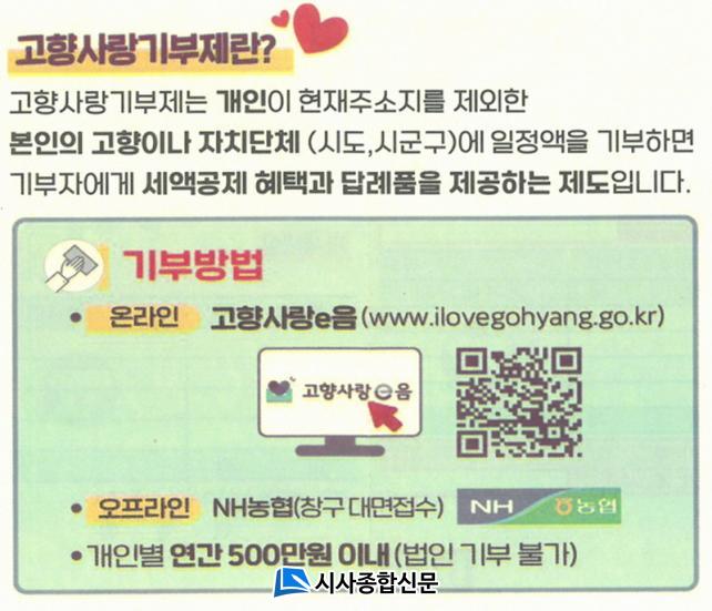 °íÁö¼ ³» ¾È³»¹®¿¡´Â °íÇâ»ç¶û±âºÎÁ¦ÀÇ ½ÃÇà ¾È³» ¹®±¸¿Í ÇÔ²² ¼¼Á¦ÇýÅÃ, ±âºÎÇѵµ¾×, ±âºÎ¹æ¹ý µîÀ» ±âÀçÇß´Ù. °íÇâ»ç¶û ±âºÎÁ¦´Â °³ÀÎÀÌ ÇöÀç ÁÖ¼ÒÁö¸¦ Á¦¿ÜÇϰí ÀÚ½ÅÀÇ °íÇâÀ̳ª ¿øÇÏ´Â ÁöÀÚü¿¡ ÀÏÁ¤¾×À» ±âºÎÇÏ´Â Á¦µµ´Ù. ¼¼¾×°øÁ¦ ÇýÅðú ÇÔ²² Áö¿ªÆ¯»êǰ µî ´ä·ÊǰÀ» Á¦°ø¹Þ°í, ÁöÀÚü´Â ±âºÎ±ÝÀ» Áֹκ¹Áö»ç¾÷ µî¿¡ Ȱ¿ëÇØ Áö¿ª°æÁ¦ Ȱ¼ºÈ¿¡ Å« µµ¿òÀÌ µÉ Àü¸ÁÀÌ´Ù.