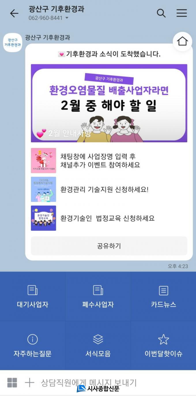 À̹ø ¼ÒÅë ⱸ ¿î¿µÀº ȹÀÏÀûÀÎ ÁöµµÁ¡°Ë ¹æ½Ä¿¡¼ ¹þ¾î³ª ÇÊ¿äÇÑ Á¤º¸¸¦ Á¦°øÇØ »ç¾÷ÀÚÀÇ È¯°æ¿À¿°¹°Áú°ü¸® ºÎ´ãÀ» ÁÙÀ̱â À§ÇØ ÃßÁøµÆ´Ù. °¡ÀÔ´ë»óÀº ±¤»ê±¸ ´ë±â‧Æó¼ö ¹èÃâ½Ã¼³ ½Å°í ¹× Çã°¡ »ç¾÷ÀåÀÌ´Ù. īī¿ÀÅå¿¡¼ ¡®±¤»ê±¸ ±âÈÄȯ°æ°ú¡¯¸¦ °Ë»öÇÑ ÈÄ Ã¤³ÎÀ» Ãß°¡ÇÏ¸é µÈ´Ù.