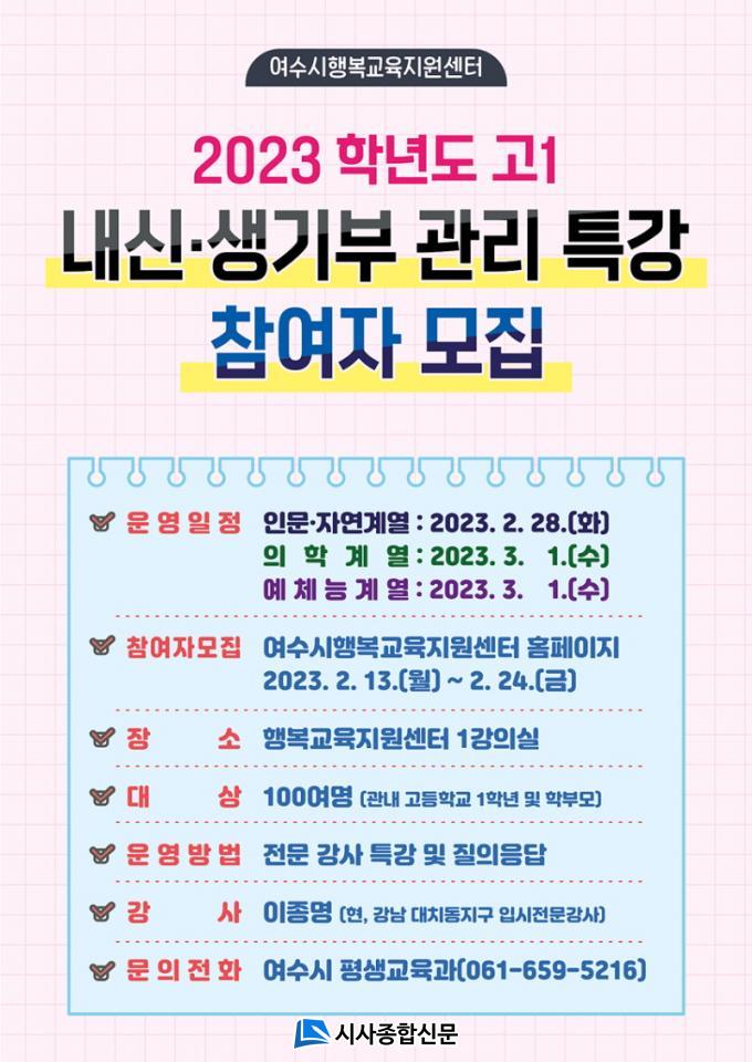 | ¿©¼ö½Ã, 2023Çг⵵ °í1 ³»½Å ¹× »ý±âºÎ °ü¸®Æ¯° ¿î¿µ 28ÀϺÎÅÍ ´ëÇа迺° Ư°¡¦24ÀϱîÁö ¿©¼ö½ÃÇູ±³À°Áö¿ø¼¾ÅÍ È¨ÆäÀÌÁö ½Åû |