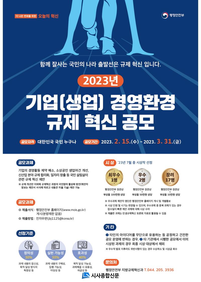 À̹ø °ø¸ðÀüÀº ±â¾÷ÀÇ °æ¿µÈ°µ¿ Á¦¾à ÇØ¼Ò, ¼Ò»ó°øÀÎ »ý¾÷ ¿©°Ç °³¼±, ½Å»ê¾÷ ºÐ¾ß ±ÔÁ¦ ÇÕ¸®È, ÀÏÀÚ¸® âÃâ, Ãë¾÷․â¾÷ ±âȸ È®´ë µî ±¹¹Î »ì¸²»ìÀÌ °ü·Ã ±ÔÁ¦¸¦ ¹ß±¼ÇÏ°í °³¼±ÇϰíÀÚ ¸¶·ÃµÆ´Ù.