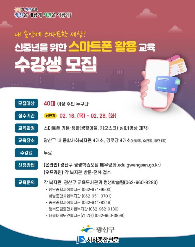3¿ùºÎÅÍ 12ÀϱîÁö ÷´Ü‧Çϳ²‧¼Û±¤‧Çູµå¸² µî ±¤»ê±¸ Á¾ÇÕ»çȸº¹Áö°ü 4°³¼Ò¿Í °æ·Î´ç 4°³¼Ò¿¡¼ ÁøÇàÇÑ´Ù. 16ÀϺÎÅÍ 28ÀϱîÁö ±¤»ê±¸ Æò»ýÇнÀÆ÷ÅÐ ¡®¹è¿ì¶û²²¡¯(https://edu.gwangsan.go.kr)¸¦ ÅëÇØ ½ÅûÇÒ ¼ö ÀÖ´Ù. °¢ º¹Áö°ü¿¡ ¹æ¹®Çϰųª ÀüÈÇØ Á¢¼öÇÏ´Â °Íµµ °¡´ÉÇÏ´Ù. Á¤¿øÀº ÇÁ·Î±×·¥´ç 15¸íÀÌ¸ç ¼±Âø¼ø ¸¶°¨ÇÑ´Ù. ¼ö°·á´Â ¹«·á´Ù.