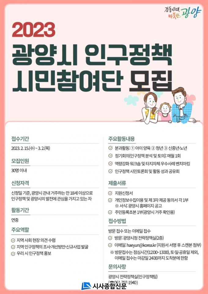 | ±¤¾ç½Ã, 2023³â Àα¸Á¤Ã¥ ½Ã¹ÎÂü¿©´Ü ¸ðÁý 30¸í À̳» ¸ðÁý, ¿À´Â 3¿ù 2ÀϱîÁö ±¤¾ç½Ã Àü·«Á¤Ã¥½Ç À̸ÞÀÏ ¶Ç´Â ¹æ¹® ½Åû |
