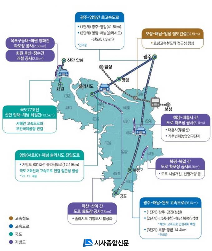 ±¤ÁÖ~³ªÁÖ~¿µ¾Ï~°Áø~ÇØ³²~¿Ïµµ¸¦ ÀÕ´Â °í¼Óµµ·Î »ç¾÷Àº ÃÑ¿¬Àå 88.61Km, 4Â÷¼± °í¼Óµµ·Î¸¦ °Ç¼³Çϱâ À§ÇØ ¾à 3Á¶ 4,000¾ï¿øÀÌ ¼Ò¿äµÇ¸ç, ±¤ÁÖ ¼±¸ º®Áøµ¿~°Áø ¼ºÀü 1´Ü°è(51.11km), °Áø ÀÛõ~ÇØ³² ºÏÆò 2´Ü°è(37.5km)·Î ³ª´©¾î ÃßÁø ÁßÀÌ´Ù.