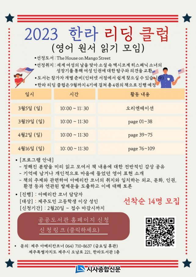 | ÇѶ󵵼°ü, Á¦ÁÖ ¾Æ¸Þ¸®ÄÄÚ³Ê, ÇѶó Reading Club ÇÁ·Î±×·¥ ¿î¿µ 20ÀϺÎÅÍ µµ³» °íµîÇлý ¹× ¼ºÀÎ ´ë»ó ¼±Âø¼ø ¸ðÁý |