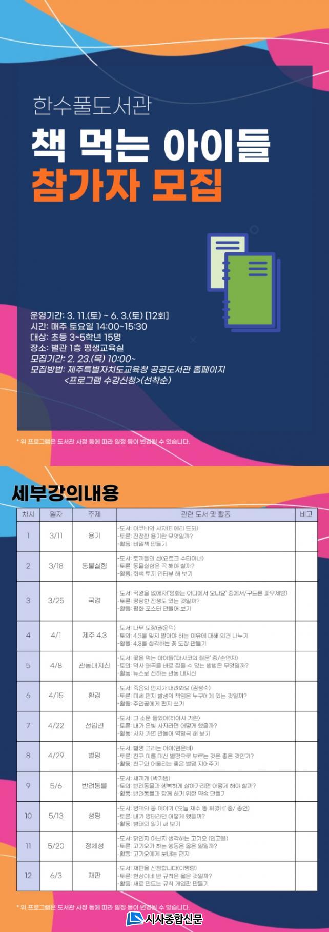 ¾î¸°ÀÌ µ¶¼È¸ Ã¥ ¸Ô´Â ¾ÆÀ̵éÀº ÃʵîÇб³ 3~5Çгâ 15¸íÀ» ´ë»óÀ¸·Î 2¿ù 23ÀÏ(¸ñ) 10½ÃºÎÅÍ Á¦ÁÖÆ¯º°ÀÚÄ¡µµ±³À°Ã» °ø°øµµ¼°ü ȨÆäÀÌÁö(org.jje.go.kr/lib)¸¦ ÅëÇØ ¼ö°»ý ¸ðÁýÀ» ¹Þ´Â´Ù.