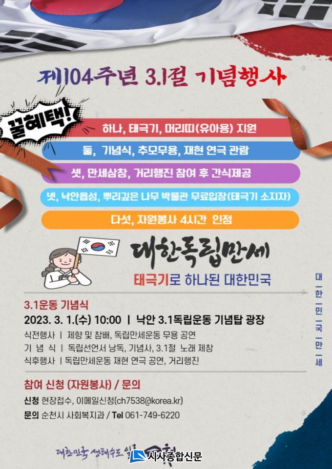 ½Ã´Â Çà»ç ´çÀÏ¿¡ Âü¿©ÀÚ Àü¿ø¿¡°Ô ¼ÒÇü űر⸦ ¹èºÎÇÏ°í ¾î¸°À̵鿡°Ô´Â űظ¶Å©°¡ ±×·ÁÁø ¸Ó¸®¶ì¸¦ ¹èºÎÇϸç, °Å¸®ÇàÁø¿¡ ³¡±îÁö Âü¿©ÇÑ ½Ã¹Îµé¿¡°Ô ³«¾È3․1¿îµ¿¾Ö±¹Áö»çÀ¯Á·È¸¿¡¼ ¼ÒÁ¤ÀÇ ±â³äǰÀ» Á¦°øÇÑ´Ù. ´õºÒ¾î űر⸦ ¼ÒÁöÇÑ ½Ã¹ÎÀº ³«¾ÈÀ¾¼º°ú »Ñ¸®±íÀº³ª¹«¹Ú¹°°ü ÀÔÀåÀÌ ¹«·áÀ̸ç, ÇöÀå¿¡¼ µî·ÏÇÑ ÀÚ¿øºÀ»çÀÚ¿¡ ÇÑ ÇØ ÀÚ¿øºÀ»ç 4½Ã°£À» ÀÎÁ¤ÇÑ´Ù.