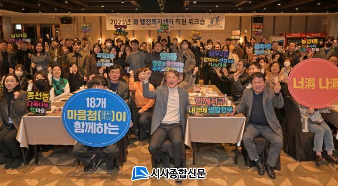 ¾Õ¼ ¼±¸´Â Áö³ 24ÀÏ 18°³ µ¿ ÇàÁ¤º¹Áö¼¾ÅÍ Á÷¿ø 150¿© ¸íÀ» ´ë»óÀ¸·Î ¹Î¿ø¼ºñ½º Áú Çâ»ó, ¼ÒÅë°ú Çù¾÷À» ÅëÇÑ È¿À²Àû Á¶Á÷¹®È Á¶¼ºÀ» À§ÇÑ ¿öÅ©¼óÀ» ÁøÇàÇϰí, °¢ µ¿ÀÇ ¿ì¼ö»ç·Ê¸¦ °øÀ¯Çß´Ù. <»çÁø>