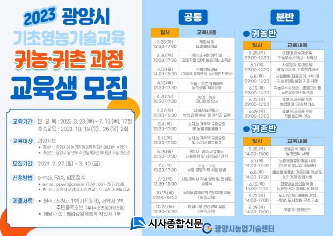 ¡®±âÃÊ¿µ³ó±â¼ú±³À°¡¯Àº 3¿ù 23ÀϺÎÅÍ 7¿ù 13ÀϱîÁö 17ȸ(¹Ýº° 61½Ã°£)¿¡ °ÉÃÄ ³ó¾÷Àα³À°°ü°ú Áö¿ª ³» ¿ì¼ö³ó°¡ ÇöÀå µî¿¡¼ °øÅë±³À°(±Í³ó‧±ÍÃÌ ¼³°è, ³óÃÌ»ýȰ ÀûÀÀ¿ä·É, ³óÁö¹ý ¹× ³ó¾÷»ýȰ¹ý·ü µî)À» ÁøÇàÇÑ´Ù. À̾î, ±Í³ó¹Ý(±âÃÊ Àç¹è±â¼ú, ¼±µµ³ó°¡ ÇöÀå±³À°)°ú ±ÍÃ̹Ý(³óÃÌÀ¶º¹ÇÕ»ê¾÷, ³óÃÌüÇè µî)À¸·Î ³ª´² ºÐ¹Ý ±³À°ÀÌ ÁøÇàµÈ´Ù.