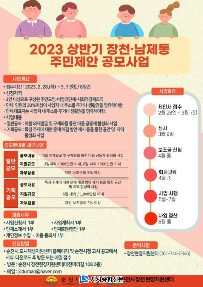 ÃÖÁ¾ ¼±Á¤µÈ ÆÀÀº ȸ°è ±³À°À» ¸¶Ä£ ÈÄ ¿À´Â 5¿ùºÎÅÍ º»°ÝÀûÀ¸·Î ÁÖ¹ÎÁ¦¾È °ø¸ð»ç¾÷À» ÃßÁøÇÏ°Ô µÈ´Ù. °ø¸ð»ç¾÷¿¡ ´ëÇÑ ÀÚ¼¼ÇÑ »çÇ×Àº ¼øÃµ½Ã ´©¸®Áý °í½Ã°ø°í¸¦ È®ÀÎÇϰųª ÀåõÇöÀåÁö¿ø¼¾ÅÍ(061-746-0346)·Î ¹®ÀÇÇÏ¸é µÈ´Ù.