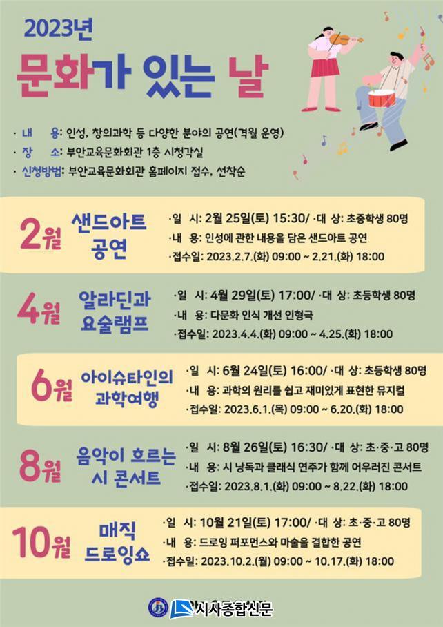 | ºÎ¾È±³À°¹®Èȸ°ü, ÇлýÀÇ ¿¹¼úÀû °¨¼ö¼ºÀ» ä¿ì´Â ¡¸¹®È°¡ ÀÖ´Â ³¯¡¹ ¿î¿µ Çлý ´ë»óÀ¸·Î Àμº µî ´Ù¾çÇÑ ºÐ¾ßÀÇ °ø¿¬, 2¿ùºÎÅÍ 10¿ù±îÁö °Ý¿ù ¿î¿µ |