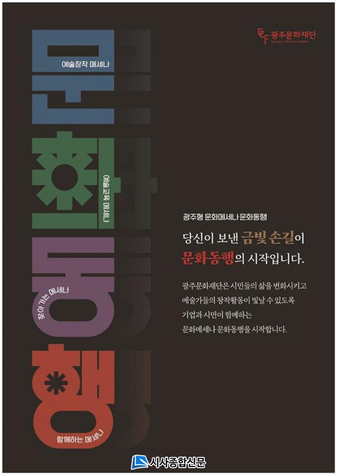 ±¤ÁÖÇü ¹®È¸Þ¼¼³ªÀÎ ¡®¹®Èµ¿Ç࡯Àº ¹®È¿¹¼ú¿¡ °ü½É ÀÖ´Â ½Ã¹Î, ±â¾÷ÀÇ ±âºÎ¸¦ ÅëÇØ ¿¹¼úÀÎÀÇ Ã¢ÀÛȰµ¿À» Áö¿øÇÏ´Â »ç¾÷ÀÌ´Ù. ¸Þ¼¼³ª ¹ß±¼, ¿¹¼ú âÀÛ Áö¿ø, ½Ã¹Î ¹®ÈÇâÀ¯ ±âȸ È®´ë¶ó´Â ¼±¼øÈ¯ °í¸®¸¦ Ȱ¼ºÈÇØ ¹®ÈÀû ¼ÒÅë°ú ½Å·Ú¸¦ È®»êÇÏ°í ¹Ì·¡ ÁöÇâÀûÀÎ ¿¹¼úȯ°æ Á¶¼º¿¡ ±â¿©ÇÑ´Ù.
