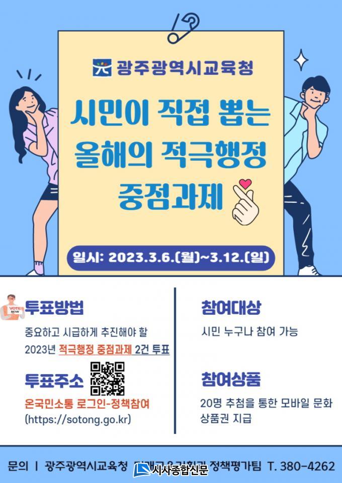 ƯÈ÷, ¿ÃÇØ´Â ½Ã¹ÎµéÀÇ ¸ñ¼Ò¸®¸¦ ¹Ý¿µÇϱâ À§ÇØ ½Ã¹ÎÀÌ Á÷Á¢ ½Ã±³À°Ã»ÀÇ Àû±ØÇàÁ¤ ÁßÁ¡°úÁ¦¸¦ ÃÖÁ¾ ¼±Á¤Çϵµ·Ï Çß´Ù. ¿Â¶óÀÎ ÅõÇ¥´Â ÇàÁ¤¾ÈÀüºÎ ¡®¿Â±¹¹Î¼ÒÅ롯 ´©¸®Áý ³» Á¤Ã¥Âü¿©-±¹¹Î½É»ç¿¡¼ °¡´ÉÇÏ´Ù. À¥Æ÷½ºÅÍ ³» QRÄڵ带 ÅëÇØ¼µµ °£´ÜÇÏ°Ô Á¢¼ÓÇÒ ¼ö ÀÖ´Ù.