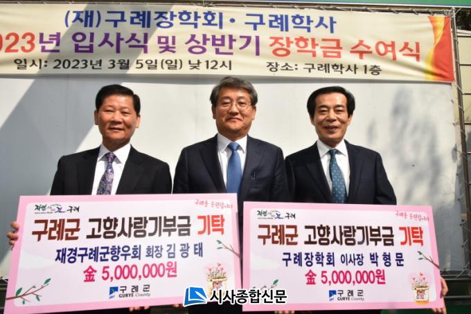 Áö³ 5ÀÏ ¿¸° 2023³â ±¸·ÊÇлç ÀÔ»ç½Ä ¹× »ó¹Ý±â ÀåÇÐ±Ý ¼ö¿©½Ä°ú ÇÔ²² ÁøÇàµÈ °íÇâ»ç¶û±âºÎÁ¦ ±âŹ±Ý Àü´Þ½Ä¿¡¼ ±è±¤Å ȸÀå°ú ¹ÚÇü¹® ÀÌ»çÀåÀº °¢ 500¸¸ ¿ø¾¿À» ±¸·Ê±º¿¡ ±âŹÇÏ¿´´Ù.