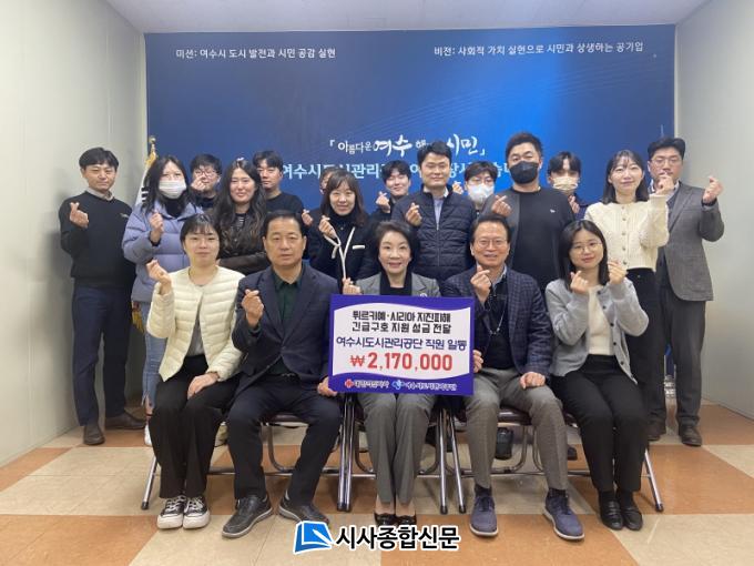 ¿©¼ö½Ãµµ½Ã°ü¸®°ø´ÜÀÇ ±èÀ¯È ÀÌ»çÀåÀº ¡° ¿¹±âÄ¡ ¸øÇÑ ´ëÁöÁøÀ¸·Î »îÀÇ ÅÍÀüÀ» ÀÒÀº Æ¢¸£Å°¿¹¡¤½Ã¸®¾Æ ±¹¹Îµé¿¡°Ô ±íÀº À§·ÎÀÇ ¸»¾¸À» ÀüÇÑ´Ù.¡±¸ç ¡°¿©¼ö½Ãµµ½Ã°ü¸®°ø´Ü Á÷¿øµéÀÇ ¸¶À½À» ´ãÀº À̹ø ±¸È£ Áö¿ø±ÝÀÌ Æ¢¸£Å°¿¹¿Í ½Ã¸®¾ÆÀÇ ÇÇÇØº¹±¸¿¡ Á¶±ÝÀ̳ª¸¶ µµ¿òÀÌ µÇ±â¸¦ ¹Ù¶õ´Ù.¡±°í ¸»Çß´Ù.