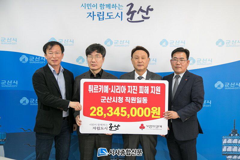 [½Ã»çÁ¾ÇսŹ® = ¿À½ÂÅà ±âÀÚ] ±º»ê½Ã °øÁ÷ÀÚµéÀÌ Æ¢¸£Å°¿¹¡¤½Ã¸®¾Æ ±¹°æÁö¿¡¼ ¹ß»ýÇÑ ´ëÁöÁøÀ¸·Î ÀÎÇØ ¾î·Á¿òÀ» °Þ°í ÀÖ´Â ÀÌÀç¹ÎµéÀ» µ½°íÀÚ ¼º±Ý 2,800¿©¸¸¿øÀ» ¸ð±ÝÇØ Àü´ÞÇß´Ù.