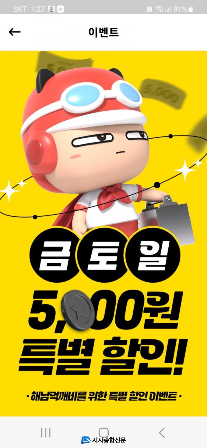 À̹ø À̺¥Æ®´Â Çà»ç ±â°£ ³» ¸Ô±úºñ ¾ÛÀ¸·Î ÁÖ¹®¡¤°áÁ¦ÇÑ ÇØ³²±º ÀÌ¿ëÀÚ ÇÑÁ¤À¸·Î 5,000¿ø ÇÒÀÎÄíÆùÀÌ ¹ßÇàµÈ´Ù. ¸ÅÁÖ ±Ý¡¤Å䡤ÀÏ 1ÀÎ 1ȸ, ¼±Âø¼ø 100¸í ÇÑÁ¤À¸·Î ¿¹»ê ¼ÒÁø ½Ã±îÁö Áö±ÞµÈ´Ù.