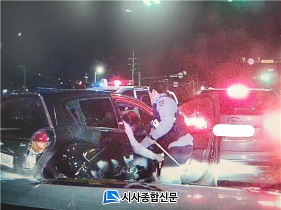 [½Ã»çÁ¾ÇսŹ® = Àå¹Î±Ô ±âÀÚ] ±¤¾ç°æÂû¼°¡ ÁÖÂ÷µÈ Â÷·®À» ÈÉÄ£ µÚ ½Ã¼Ó 150km·Î ³Æø¿îÀüÀ» ÇÏ¸ç µµÁÖ±ØÀ» ¹úÀÎ 10´ëµéÀÌ °æÂû¿¡ ´ú¹Ì¸¦ ÀâÇû´Ù.