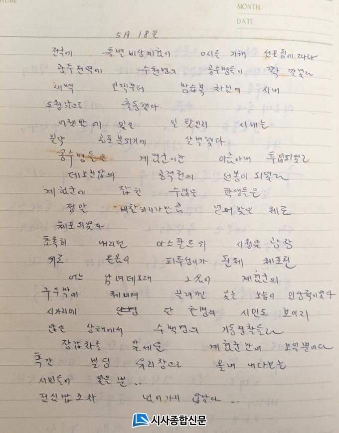 È«ÀÎÈ 5¡¤18¹ÎÁÖȿ±â·Ï°üÀåÀº ¡°ÀÌ ÀϱâÀåÀº 5¿ù ÇöÀå¿¡¼ °æÂûÀÌ ¾´ ±â·Ï¹°·Î¼ Àǹ̰¡ ±í´Ù¡±¸ç ¡°5¡¤18 ÇöÀå¿¡¼ Àü°æÀÇ ´«À¸·Î ÀÛ¼ºµÈ ¶Ç ÇϳªÀÇ ¿À¿ùÀϱⰡ 5¿ùÀÇ °¡Ä¡¸¦ ÀçÁ¶¸íÇÏ´Â Áß¿äÇÑ ÀÚ·á°¡ µÇ±æ ¹Ù¶õ´Ù¡±°í ¸»Çß´Ù. <³¡>