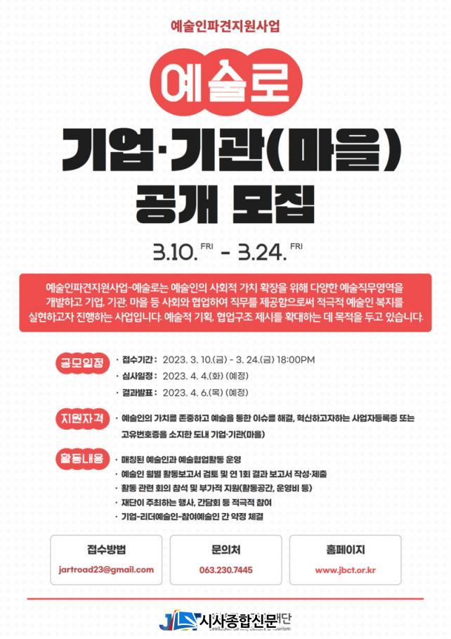 º» »ç¾÷¿¡ Âü¿©ÇÒ ±â¾÷¡¤±â°ü(¸¶À»)ÀÇ °ø°³ ¸ðÁýÀ» ½ÃÀÛÀ¸·Î ¿ÃÇØ¡®ÀüºÏ¿¹¼ú·Î¡¯°¡ ù¹ßÀ» ³»µðµò´Ù. ¡®ÀüºÏ¿¹¼ú·Î¡¯´Â ¿¹¼úÀεéÀÌ µµ³» ±â¾÷¡¤±â°ü(¸¶À»)ÀÇ À̽´¸¦ ¿¹¼úÀûÀ¸·Î ÇØ°áÇØ °¡´Â °úÁ¤À» °æÇèÇÏ°í ¿¹¼úÀÇ »çȸÀû °¡Ä¡¸¦ ½ÇÇöÇÏ´Â »ç¾÷À¸·Î ¿¹¼ú°¡µéÀº Çù¾÷Ȱµ¿¿¡ µû¶ó ¿ù 120~140¸¸¿øÀÇ È°µ¿ºñ¸¦ Áö¿ø¹Þ°Ô µÈ´Ù.