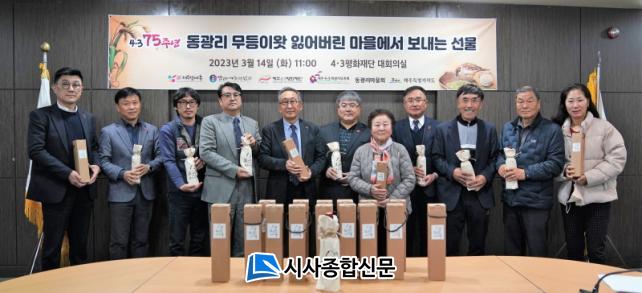 µ¿±¤¸®(ÀÌÀå ÀÌ»óÁØ), (»ç)Á¦Áֹο¹ÃÑ(ÀÌ»çÀå ±èµ¿Çö), ޶ó¹Ì¼úÀÎÇùȸ(ȸÀå °¹®¼®)´Â 3¿ù 14ÀÏ 4‧3Æòȱâ³ä°üÀ» ¹æ¹®ÇØ ¡®µ¿±¤¸® ¹«µîÀÌ¿Ó ÀÒ¾î¹ö¸° ¸¶À»¿¡¼ º¸³»´Â ¼±¹°¡¯À» Á¦ÁÖ4‧3ÆòÈÀç´Ü(ÀÌ»çÀå °íÈñ¹ü)°ú 4‧3Èñ»ýÀÚÀ¯Á·È¸(ȸÀå ±èâ¹ü)¿¡ ±âÁõÇß´Ù. Áö³ÇØ ÀÌ¾î µÎ ¹øÂ° ±âÁõÀÌ´Ù.