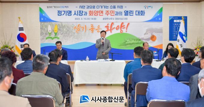 ¿©¼ö½Ã¿¡ µû¸£¸é Ⱦç¸é»ç¹«¼Ò¿¡¼ ¿¸° ù ¹øÂ° ½Ã¹Î°úÀÇ ´ëÈ¿¡ Á¤ ½ÃÀåÀº ÀÚ»ý´Üü, ÁֹδëÇ¥, ³ó‧¾î¾÷ÀÎ µî ½Ã¹Î 150¿© ¸í°ú Áï¼® ÁúÀÇÀÀ´äÀ» ÅëÇØ ¼ÒÅëÇß´Ù.