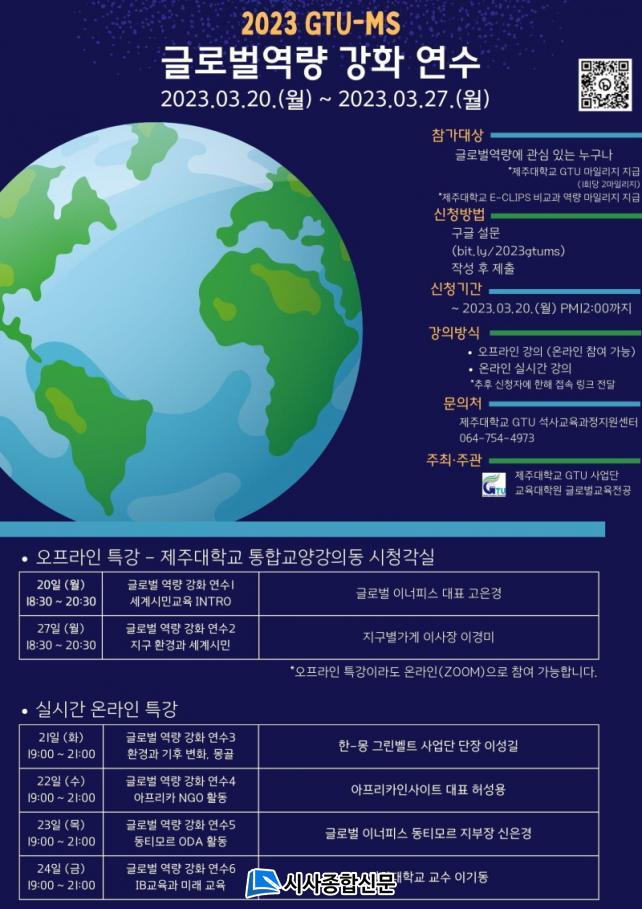 Á¦ÁÖ´ë ±Û·Î¹ú±³¿ø¾ç¼º°ÅÁ¡´ëÇлç¾÷´Ü ¼®»ç°øµ¿±³À°°úÁ¤Áö¿ø¼¾ÅÍ(¼¾ÅÍÀå ±Ç»óö)°¡ ÁÖ°üÇÏ´Â À̹ø ÇÁ·Î±×·¥Àº ±¹Á¦ Çù·Â ºñ¿µ¸® ¹Î°£´ÜüÀÎ ±Û·Î¹úÀ̳ÊÇǽº(´ëÇ¥ °íÀº°æ)¿Í Çù·ÂÇØ ¿î¿µµÇ¸ç, Á¦ÁÖ Áö¿ª (¿¹ºñ)±³¿øÀÇ ¼¼°è½Ã¹Î±³À°, Áö±¸ ȯ°æ ¹× ºó°ï À̽´, IB ±³À°°ú °ü·ÃµÈ Áö½ÄÀ» Çâ»óÀ» À§ÇÏ¿© ±âȹµÆ´Ù.