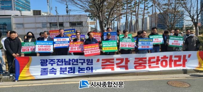 [½Ã»çÁ¾ÇսŹ® = ¿À½ÂÅà ±âÀÚ] Àü¶ó³²µµÀÇȸ ÀÌÀçÅ ÀÇ¿ø(´õºÒ¾î¹ÎÁÖ´ç, ³ªÁÖ3)ÀÌ 16ÀÏ Àü³²µµÃ» Á¤¹® ¾Õ¿¡¼ ¡®±¤ÁÖÀü³²¿¬±¸¿ø ºÐ¸® ¹Ý´ë Ã˱¸´ëȸ¡¯¸¦ °³ÃÖÇÏ°í ¡°±¤ÁÖÀü³²¿¬±¸¿ø ºÐ¸® Àý´ë ¹Ý´ë¡±¸¦ ÁÖÀåÇß´Ù.