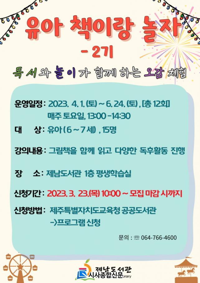 ¿î¿µ ÀÏÁ¤Àº 4¿ù 1ÀÏ(Åä)ºÎÅÍ 6¿ù 24ÀÏ(Åä)±îÁö ¸ÅÁÖ Åä¿äÀÏ¿¡ ¿î¿µµÇ¸ç À¯¾Æ(6~7¼¼)´ë»óÀ¸·Î ¿ÀÈÄ 1½ÃºÎÅÍ 2½Ã ¹Ý±îÁö ¿î¿µÇÑ´Ù. Âü°¡½ÅûÀº Á¦ÁÖÆ¯º°ÀÚÄ¡µµ±³À°Ã» °ø°øµµ¼°ü(https://org.jje.go.kr/lib/index.jje)»ó´Ü¸Þ´º [ÇÁ·Î±×·¥ ½Åû]¿¡¼ 3¿ù 23ÀÏ(¸ñ) 10½ÃºÎÅÍ ½Åû °¡´ÉÇÏ¸ç ½ÅûÀοøÀº 15¸íÀÌ´Ù.