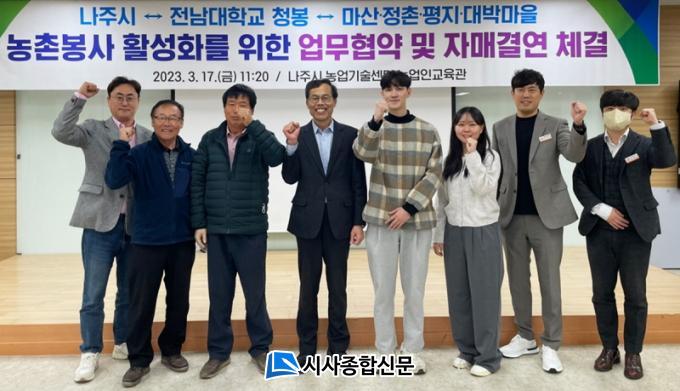 Àü¶ó³²µµ ³ªÁÖ½Ã(½ÃÀå À±º´ÅÂ)´Â ÃÖ±Ù Àü³²´ëÇб³ ÀÚ¿øºÀ»ç µ¿¾Æ¸® ´ÜüÀÎ ¡®Ã»ºÀ¡¯°ú Áö¿ª»çȸ °øÇå ¹× ³ó¹ø±â ³óÃÌÀη Áö¿øÀ» À§ÇÑ ¡®³óÃÌ ºÀ»ç Ȱ¼ºÈ ¾÷¹«Çù¾à¡¯À» ü°áÇß´Ù°í 24ÀÏ ¹àÇû´Ù. ¾ç ±â°ü¡¤´Üü´Â »çȸ°øÇå È®´ë ¹× ³óÃÌ Àη³ ÇØ¼Ò¸¦ ¸ñÇ¥·Î ³óÃÌ ºÀ»ç Ȱ¼ºÈ Áö¿øÃ¼°è¸¦ ±¸Ãà, ³ó¹ø±â ¿µ³ó ÀϼÕÀ» º¸ÅÅ ¿¹Á¤ÀÌ´Ù.