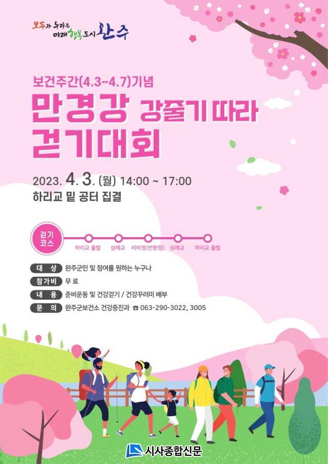 À̳¯ Çà»ç´Â º¸°ÇÁÖ°£(4.3.~4.7.)À» ¸Â¾Æ ¿¸®´Â °ÍÀ¸·Î Áö¿ªÁÖ¹ÎÀÇ °È±â ½ÇõÀ¸·Î °Ç°ÁõÁøÀ» µµ¸ðÇϰí, ¾Æ¸§´Ù¿î dz±¤À» ÀÚ¶ûÇÏ´Â ¸¸°æ° ±æÀ» ³Î¸® ¾Ë·Á ¿ÏÁÖ±º¹ÎÀÇ ÀÚ±à½ÉÀ» °íÃëÇÏÀÚ´Â Àǹ̷Π¸¶·ÃµÆ´Ù.