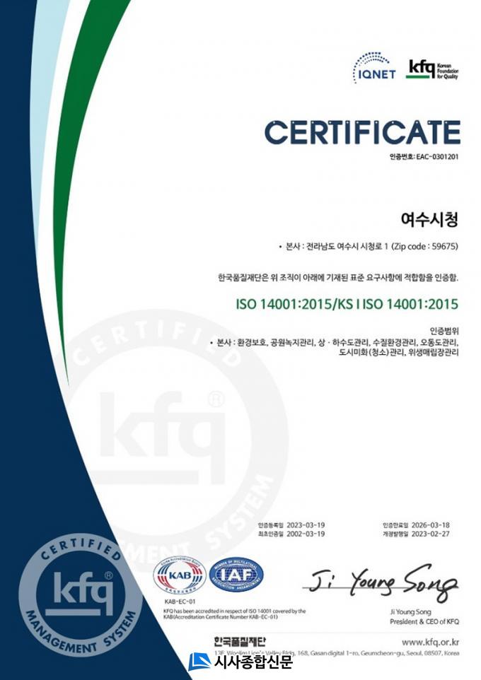 [½Ã»çÁ¾ÇսŹ® = ¿À½ÂÅà ±âÀÚ] ¿©¼ö½Ã(½ÃÀå Á¤±â¸í)°¡ ÃÖ±Ù ±¹Á¦Ç¥ÁØ È¯°æ°æ¿µ½Ã½ºÅÛ(ISO 14001) ÀÎÁõ °»½ÅÀ¸·Î 22³â° ÀÎÁõÀ» À¯ÁöÇÏ¸é¼ È¯°æÄ£ÈÀû µµ½Ã·Î¼ À§Ä¡¸¦ ±»°ÇÈ÷ Çß´Ù.