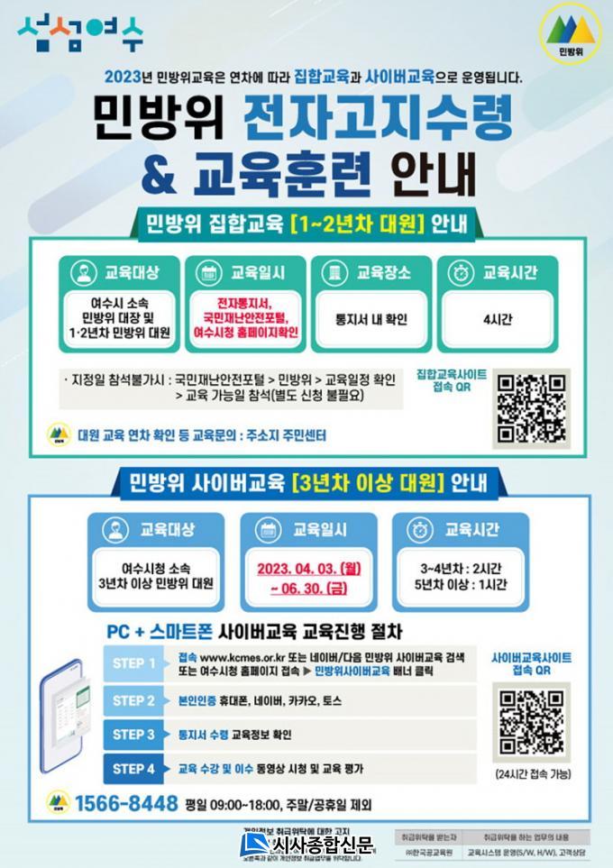 ±³À°±â°£Àº ¿À´Â 4¿ù 3ÀϺÎÅÍ 6¿ù 30ÀϱîÁö´Ù. ±³À°¹æ¹ýÀº ¿©¼ö½Ãû ȨÆäÀÌÁö¿¡ ÀÖ´Â ¹è³Ê QR½ºÄµ ¶Ç´Â Æ÷ÅлçÀÌÆ® °Ë»öÀ¸·Î ¡®¹Î¹æÀ§»çÀ̹ö±³À°(kcmes.or.kr)¡¯¿¡ Á¢¼ÓÇØ º»ÀÎÀÎÁõ ÈÄ ÁøÇàÇÒ ¼ö ÀÖ´Ù.