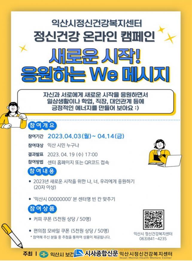ÀÍ»ê½Ã Á¤½Å°Ç°º¹Áö¼¾ÅÍ´Â ½Ã¹ÎµéÀ» ´ë»óÀ¸·Î ¿À´Â 3ÀϺÎÅÍ 14ÀϱîÁö 2ÁÖ°£ ¿Â¶óÀÎÀ¸·Î¡®2023³â »õ·Î¿î ½ÃÀÛ! ÀÀ¿øÇÏ´Â We ¸Þ¼¼Áö ÀÛ¼ºÇϱ⡯Á¤½Å°Ç° Ä·ÆäÀÎÀ» ÁøÇàÇÑ´Ù.