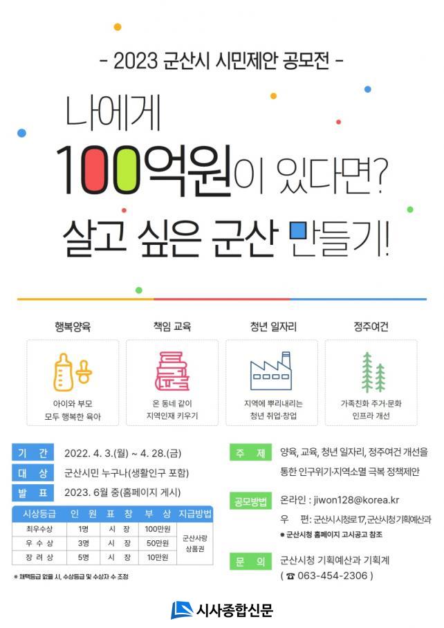 À̹ø °ø¸ðÀüÀº Áö³ 3ÀϺÎÅÍ ¿À´Â 28ÀϱîÁö 26Àϰ£ Á¢¼öÇϸç, »ýȰÀα¸¸¦ Æ÷ÇÔÇÏ¿© ±º»ê½Ã¹ÎÀ̶ó¸é ´©±¸³ª Âü¿©°¡ °¡´ÉÇÏ´Ù. ÀÌ ±â°£µ¿¾È ¾çÀ°, ±³À°, û³âÀÏÀÚ¸®, Á¤ÁÖ¿©°Ç µî »ý¾Ö ÀüÁֱ⠽ùΠÁ¤Ã¥ ¾ÆÀ̵ð¾î¸¦ À̸ÞÀÏ(jiwon128@korea.kr) ¶Ç´Â ¿ìÆí(±º»ê½Ã ½Ãû·Î 17, 5Ãþ ±âȹ¿¹»ê°ú) À» ÅëÇØ Á¦ÃâÇÏ¸é µÈ´Ù.