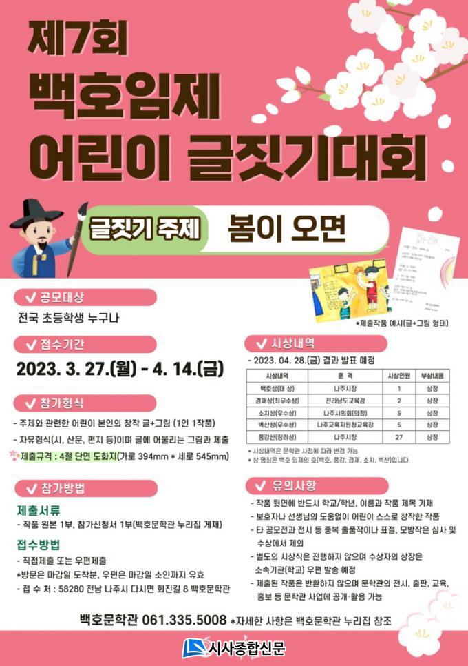 ³ªÁÖ½Ã(½ÃÀå À±º´ÅÂ)´Â Àü±¹ ¾î¸°À̸¦ ´ë»óÀ¸·Î ¡®Á¦7ȸ ¹éÈ£ ÀÓÁ¦ ¾î¸°ÀÌ ±ÛÁþ±â´ëȸ¡¯ ÀÛǰÀ» ¿À´Â 14ÀϱîÁö Á¢¼öÇÑ´Ù°í 5ÀÏ ¹àÇû´Ù.