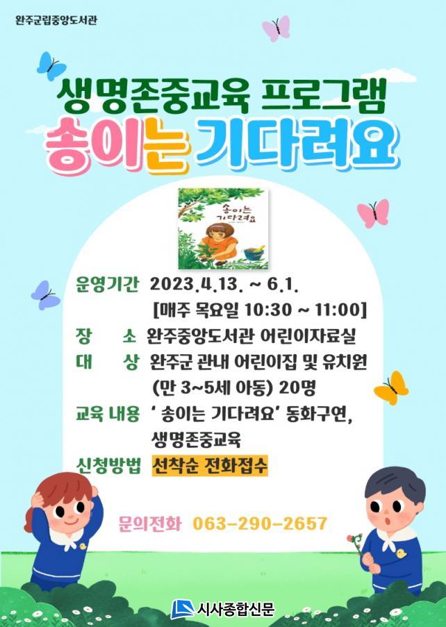 ¿À´Â 13ÀϺÎÅÍ ¿ÏÁÖ±º ¾î¸°ÀÌ(¸¸3~5¼¼) 20¸íÀ» ´ë»óÀ¸·Î ¾î¸°ÀÌÀÚ·á½Ç¿¡¼ ¸ÅÁÖ ¸ñ¿äÀÏ ¿ÀÀü 10½ÃºÎÅÍ 30ºÐ µ¿¾È ÁøÇàµÇ¸ç, ÇÁ·Î±×·¥ Âü¿©´Â ÀüÈ(063-290-2657) ·Î Á¢¼öÇÏ¸é µÈ´Ù.
