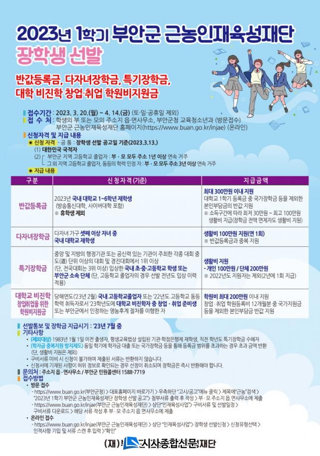 ½ÅûÀÚ´Â °øÅëÀûÀ¸·Î ÀåÇлý ¼±¹ß °ø°íÀÏ(2023. 3. 13.) ±âÁØ ´ëÇѹα¹ ±¹ÀûÀÚÀÌ¸ç ±¹³» ´ëÇб³(Ư±âÀåÇбÝÀº ±¹³» ÃÊ‧Áß‧°í) ÀçÇлýÀ̾î¾ß ÇÑ´Ù. °ü³» °íµîÇб³ Á¹¾÷ÀÚ´Â ºÎ‧¸ð ¸ðµÎ 1³â ÀÌ»ó ¿¬¼ÓÇÏ¿© ºÎ¾È±º¿¡ ÁÖ¼Ò°¡ ÀÖ¾î¾ß Çϰí, °ü¿Ü °íµîÇб³ Á¹¾÷ÀÚ´Â ºÎ‧¸ð ¸ðµÎ 3³â ÀÌ»ó ¿¬¼ÓÇÏ¿© ºÎ¾È±º¿¡ ÁÖ¼Ò¸¦ µÎ°í ÀÖ¾î¾ß ÇÑ´Ù.